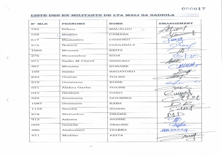 Il ressort du dossier que le 11 juin 2012, le Comité syndical des travailleurs de LTA Mali SA a déposé un préavis de grève auprès de leur employeur. Dans ledit préavis, ils demandaient la cessation immédiate des procédures de suspension et de licenciement de cinquante-six (56) travailleurs, parmi lesquels vingt-six (26) syndicalistes, le paiement de la majoration salariale de sept pour cent (7 %) pour une période de trente-deux (32) mois et d’une prime de rendement depuis 2011.